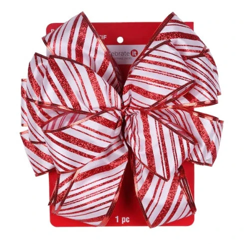 This 11″ x 53″ White Satin 16-Loop Bow with Red Glitter Candy Cane Stripes can be used as a Christmas tree topper, an accent for a large package or used to complete decorating in your home. The possibilities are endless when you have a bow of this magnitude.