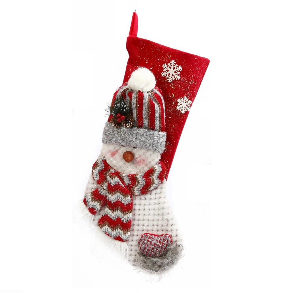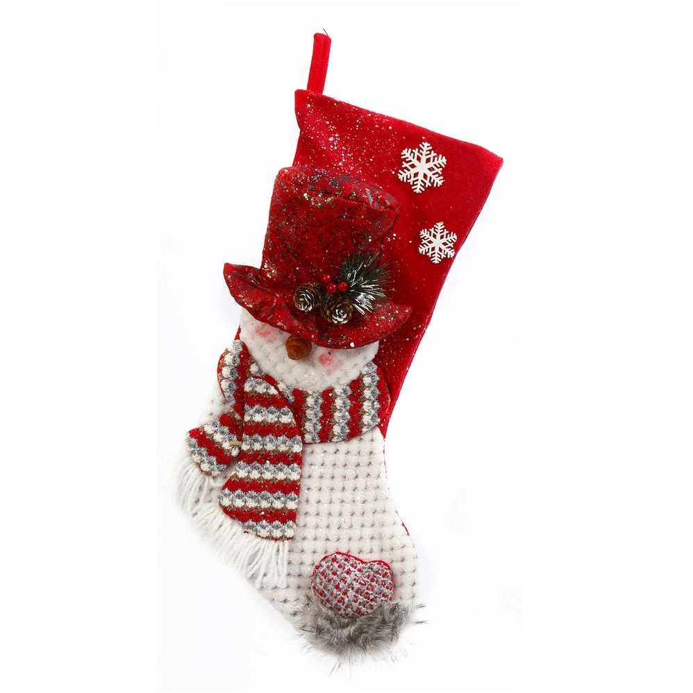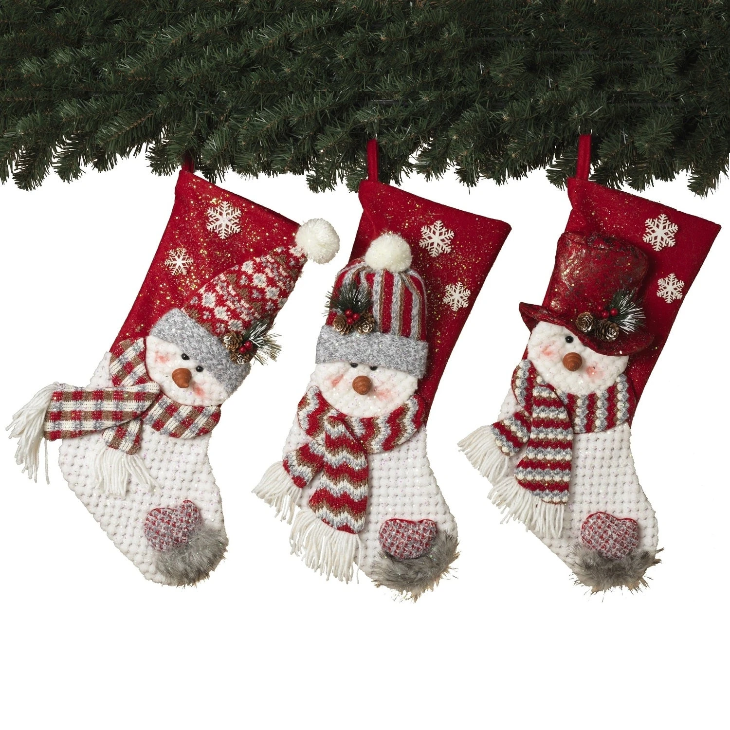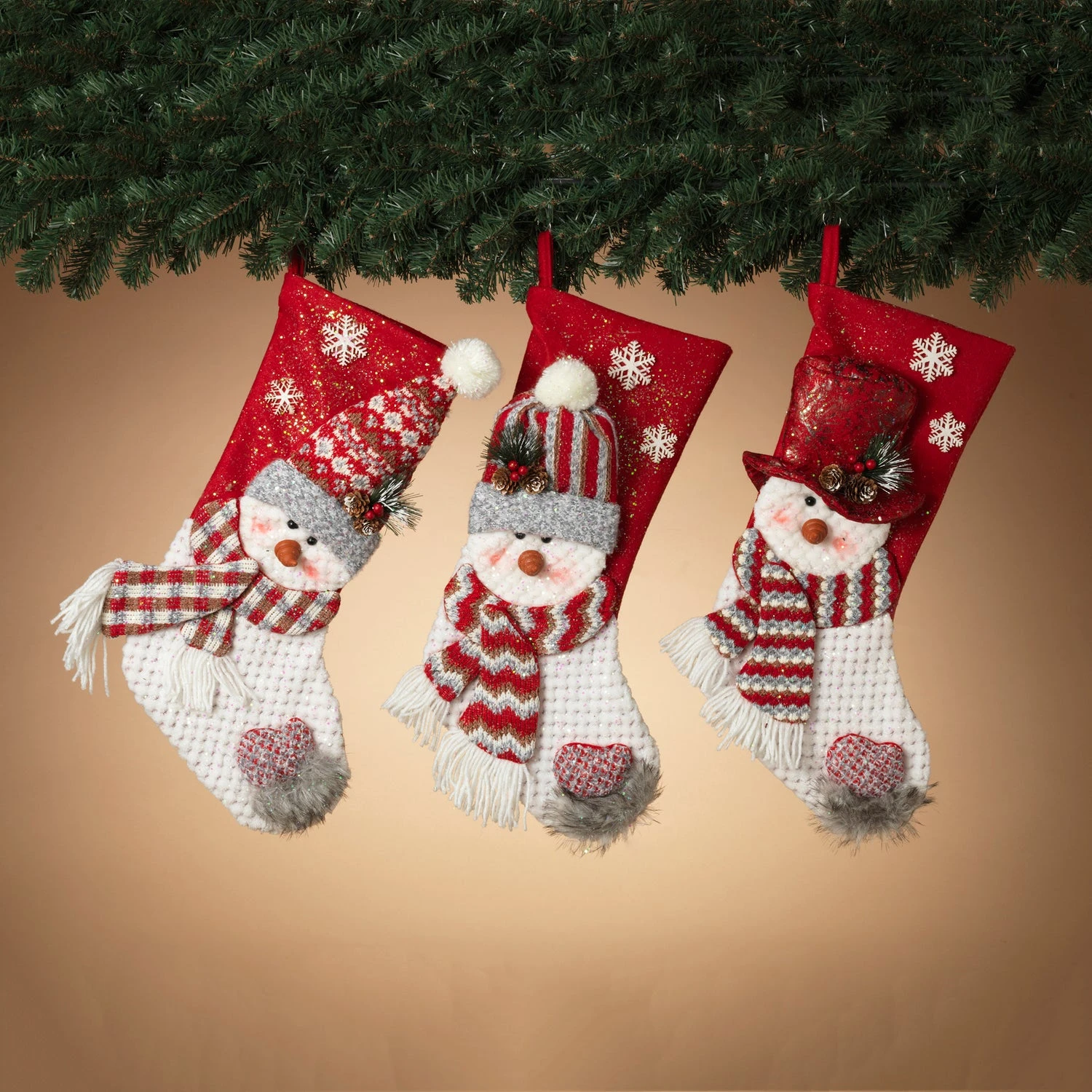 - All stockings feature plush snowmen with coal eyes and carrot noses, wearing different winter hats embellished with pine cones, berries, glitter and pine needles