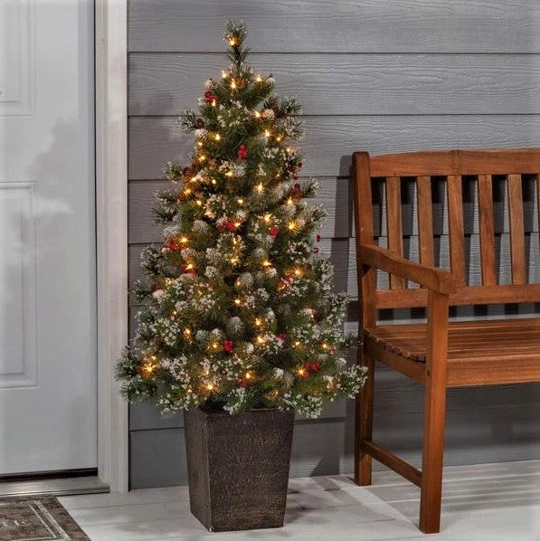 This 4′ Windsor Glazier Pine Pre-Lit Potted Artificial Christmas Tree arrives pre-decorated with faux-snow covered branch tips, pine cones and red berries. 100 clear UL lights, 210 branch tips and a 25 inch bottom branch base complete this tree and will help your table or entrance way shine this holiday season.
