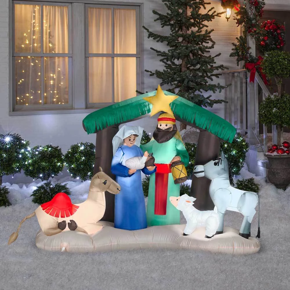 Celebrate the season with an Airblown Inflatable Nativity Scene! Featuring the Holy Family and three animal friends under the North Star, this nativity inflatable makes a meaningful addition to your outdoor Christmas decorations. Setup is super simple. Just plug it in, stake it down and watch the magic unfold. This religious Christmas decoration includes everything needed for easy setup.