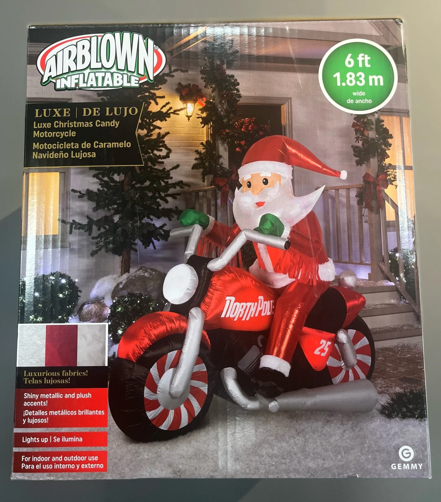 Entertain your guests with this very cool Airblown® Santa on Motorcycle. This inflatable would be a fun addition to your outdoor holiday decorating.