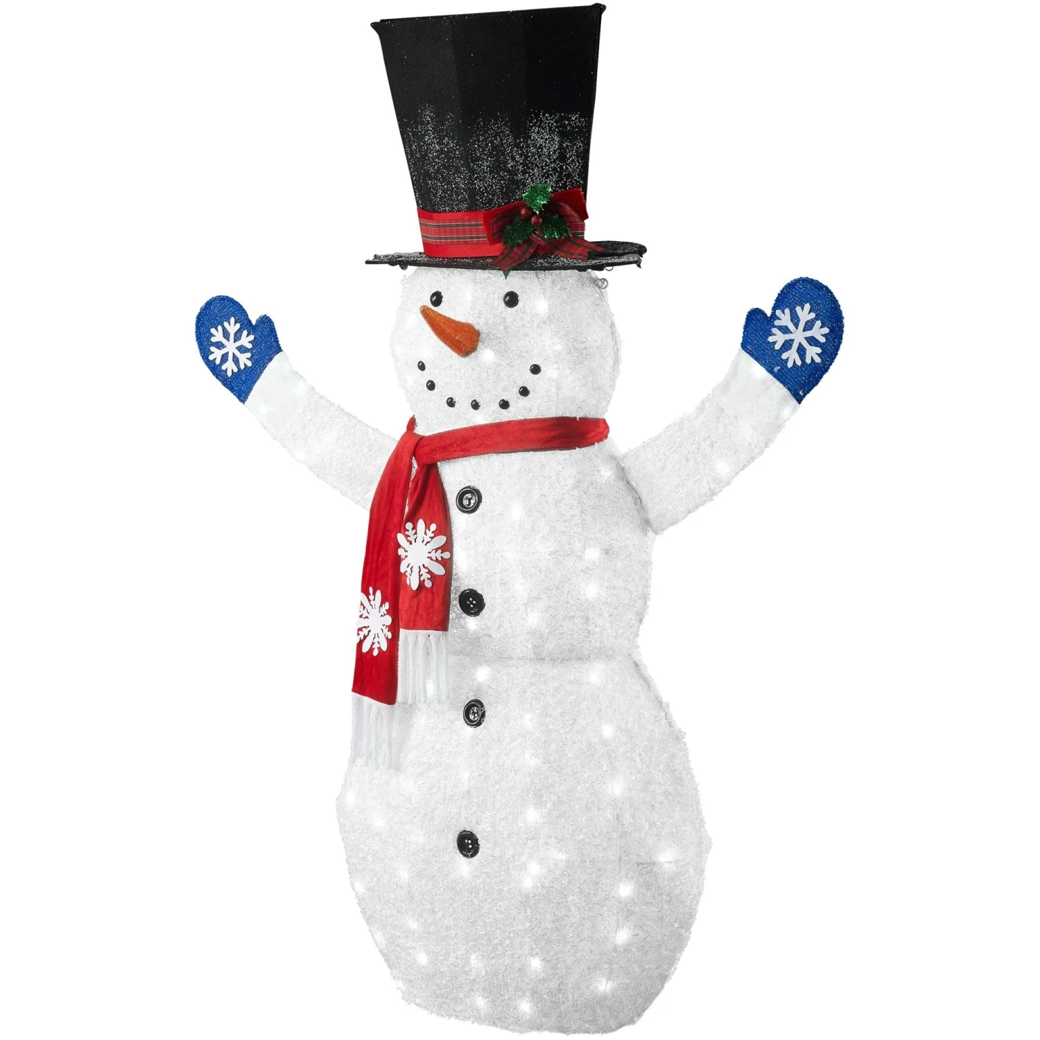 Make a winter statement with this mesh 74″ White LED Lighted Fluffy Glitter Snowman Outdoor Christmas Decoration! He will light up your holidays with his broad smile! His look is inviting even if the weather is blinding, and he will melt away the blues!