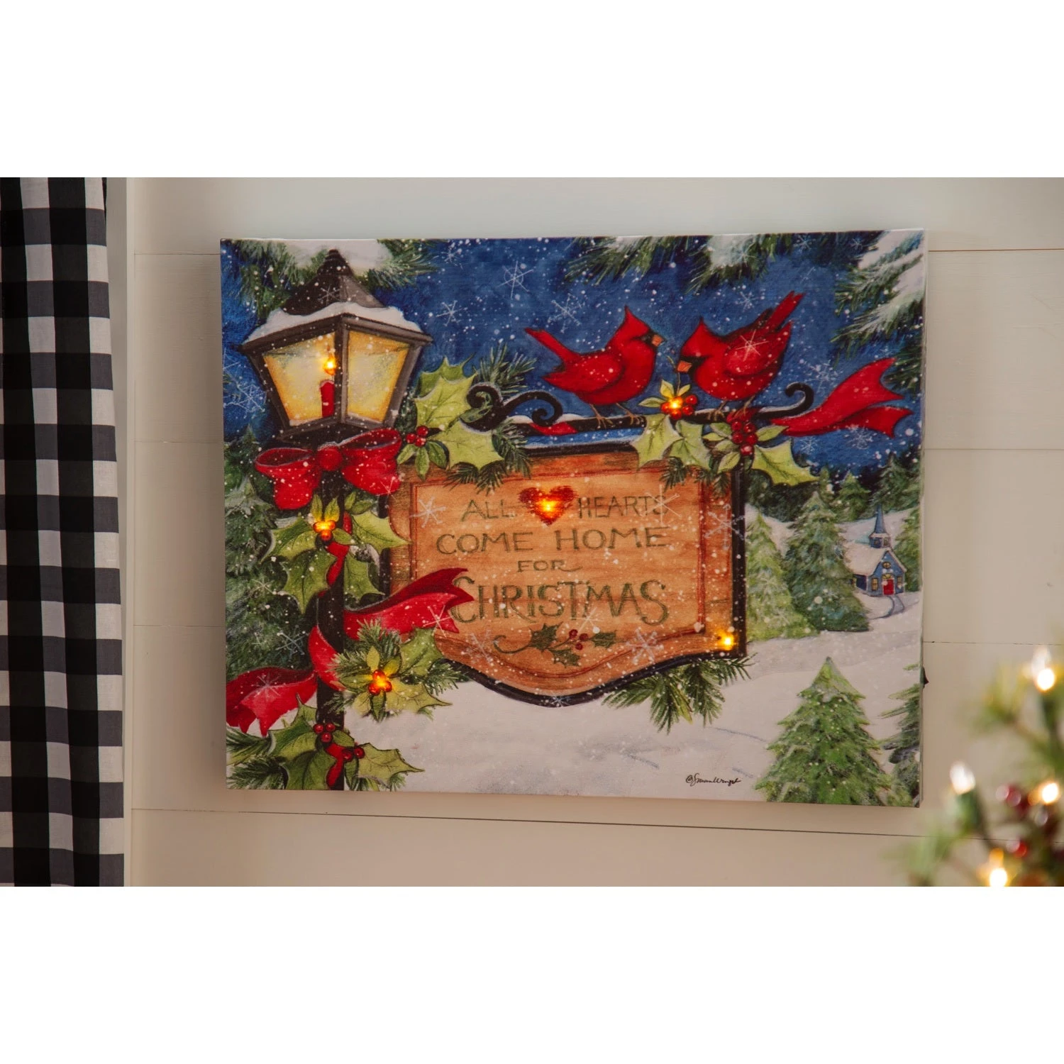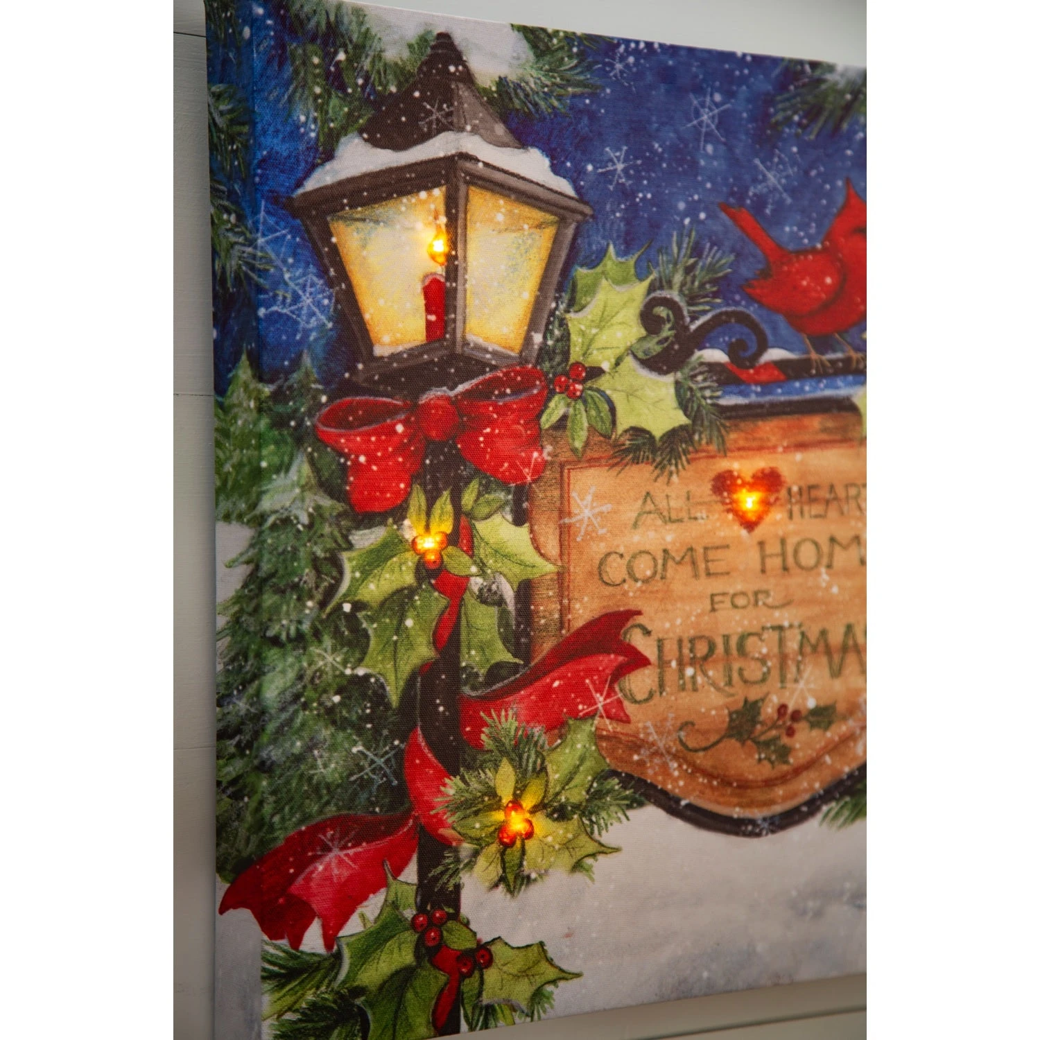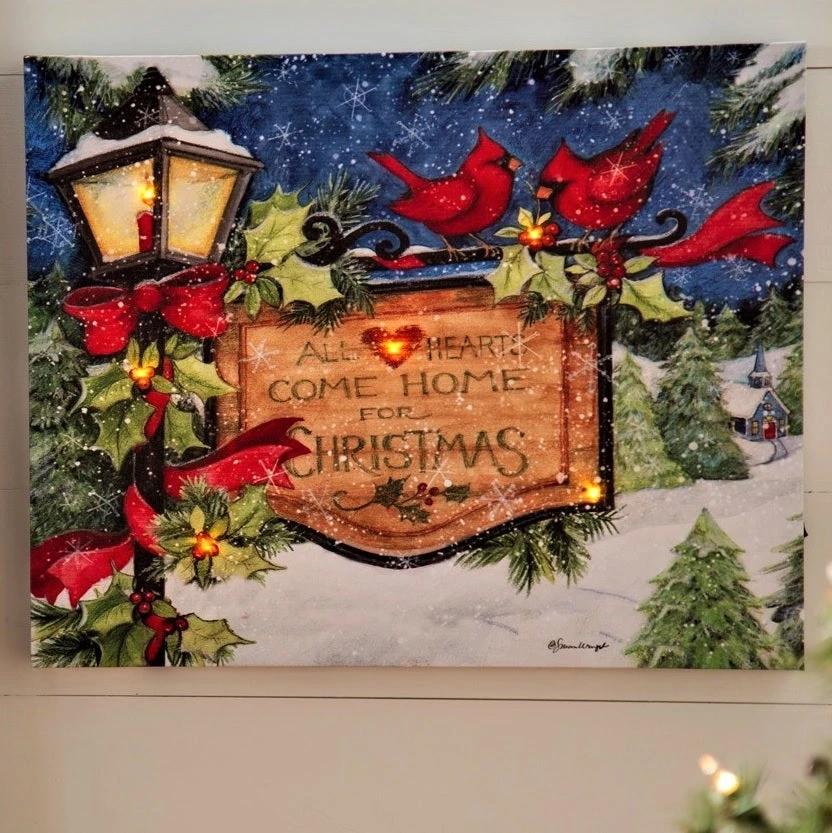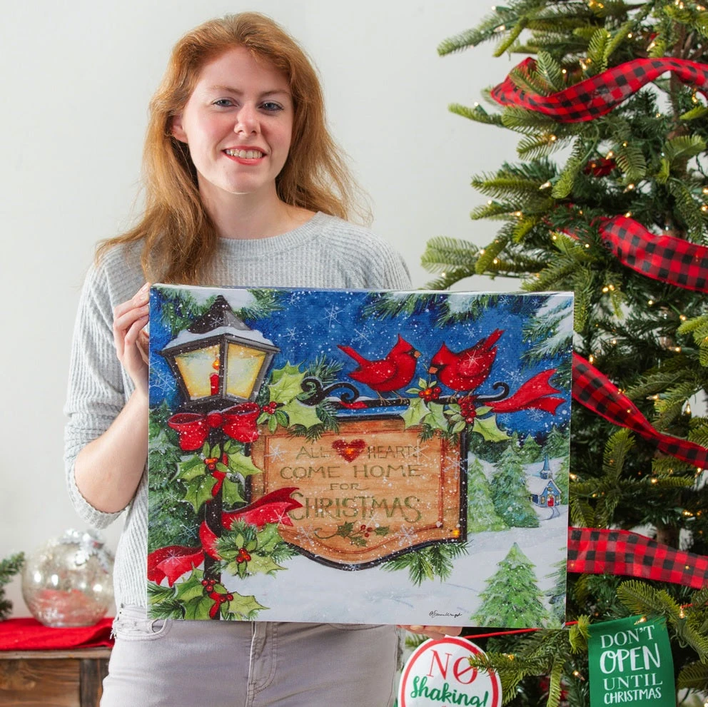 Add this beautiful Christmas Lamp Post Battery-Operated LED Canvas to your wintertime home décor. Featuring red cardinals perched on a holly and ribbon decorated lamp post, this peaceful scene has LED lights for a warm winter feel. Hang on a wall or place on a table for a festive atmosphere.