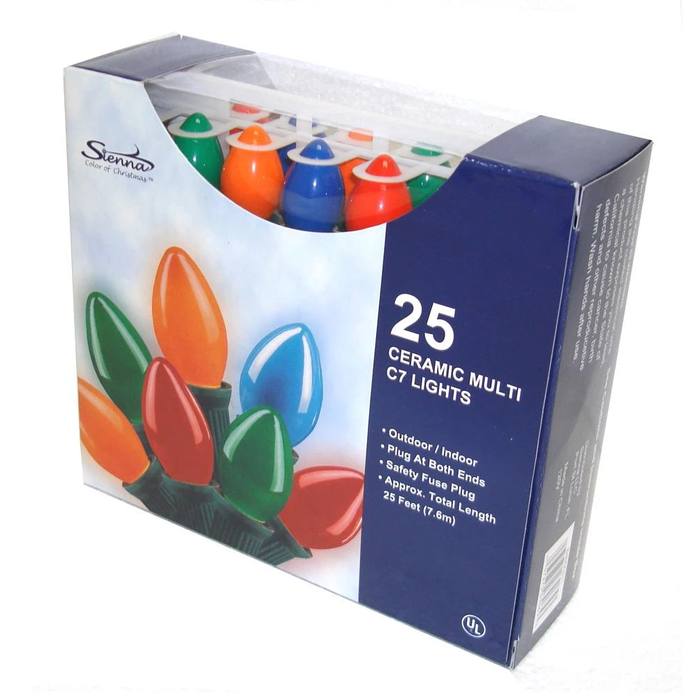 Bring back the traditional look of the 60’s and 70’s with our Set of 25 Ceramic C7 Christmas Lights. These traditional light bulbs look like they were dipped in latex paint and are perfect for outdoor patios, decks, indoor/outdoor special events and holiday lighting.